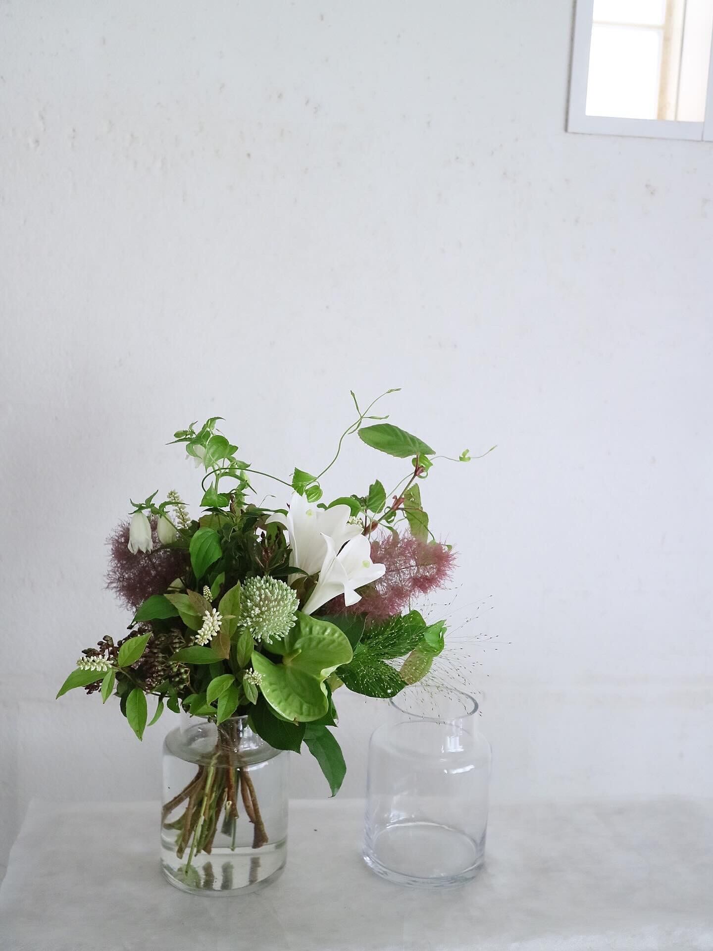 シンプルで実用的な花瓶と生花のセットをぜひお楽しみください。お届け希望日があれば備考欄にご記入くださいませ。受注後の制作となるため、お時間をいただく場合がございます。アトリエでの引き取りを希望される場合は、公式LINEにてご連絡をお待ちしております。